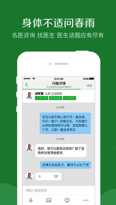 1、来自沈阳的用户:医生都很专业,回复也很及时,给我的父母也都装上了,现在已经很少去医院看病,预约挂号难不说,大夫的服务也一般,春雨信誉好 。