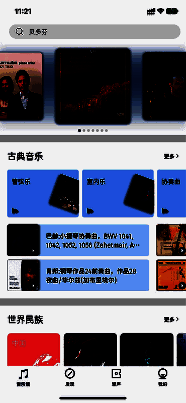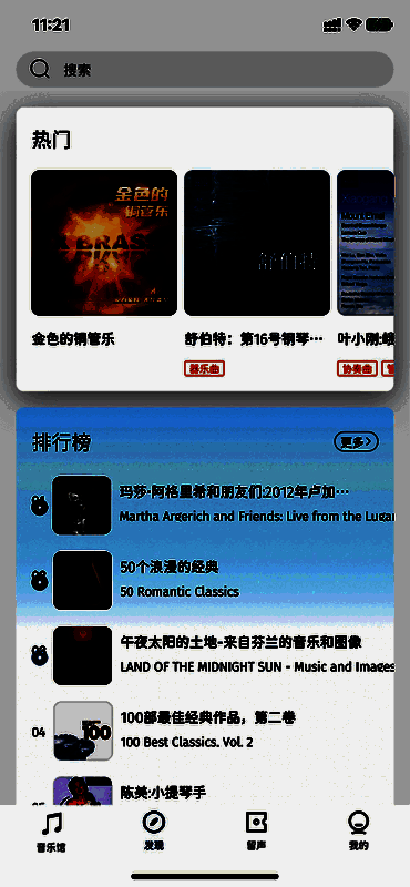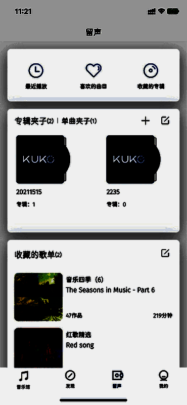 库客音乐内置四大核心功能模块:“音乐馆”汇聚了大量用户推荐的经典作品;“发现”频道智能推送符合用户口味的音乐;“留声”记录每一次播放轨迹;而“我的”页面则支持账号管理与界面自定义,满足多样化需求。