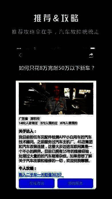 基于大数据,对不同车型每一行驶里程的疑难杂症进行归类,将专业维修师的诊断及应对方法总结为攻略,帮助车主快速排除故障;邀请业内知名的维修师和汽车大V,为车主提供原创干货内容、在线咨询及线下服务。