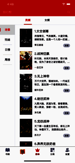 2、直观的分类设计,免费、连载、完结、男频、女频等模块的划分为你提供了快速选书通道,一触即达。