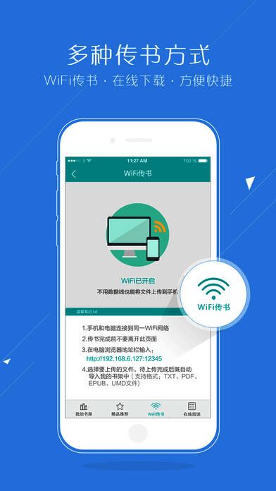 3、WiFi传书:可以通过WiFi网络将电脑中的电子书籍传到手机中,跨屏传书,一键搞定;