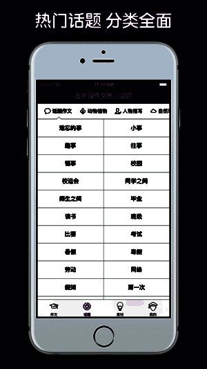 按题材可为分写人、叙事、写景、状物、读后感、想象作文、话题作文、议论文、童话寓言、演讲稿、日记、小说、期中考试作文、期末考试作文、抒情作文、说明文等,提供了按作文字数以及作文分类检索的功能。