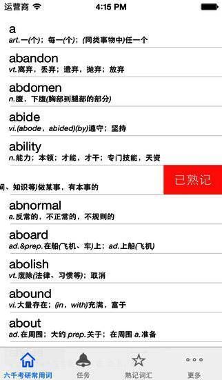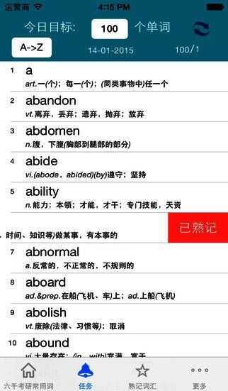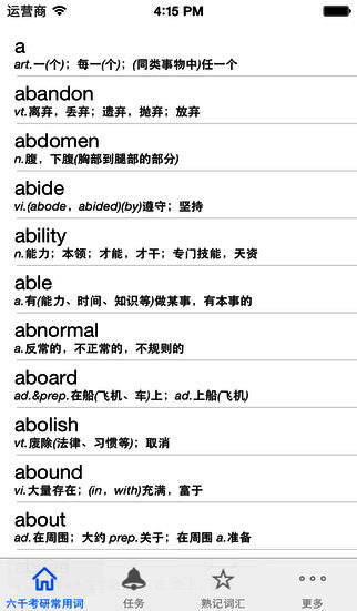 “灵灵单词”收集了约6000个考试常用词汇。本应用可以帮助您管理单词的记忆,如帮您把已经熟记的单词挑出来,让您把更多的精力和时间放在仍未熟记的单词上。该应用的目的就是让记忆单词这种枯燥无味的工作变得更加简单和高效。