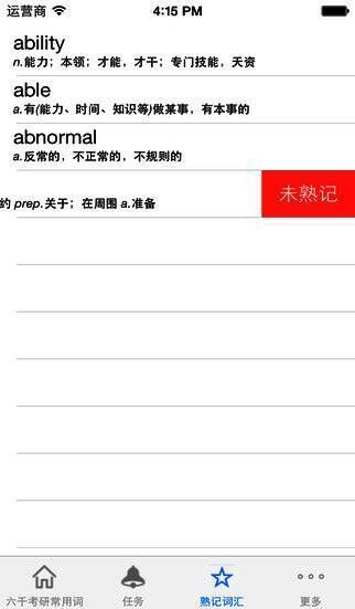 《灵灵单词》是一款专门用于外语学习的软件,收集了约6000个考试常用词汇,帮助您学习单词。本软件会帮您把记熟悉的软件跳出来不再复习,把精力全部都放在仍未熟记的单词上面,避免浪费时间和精力。