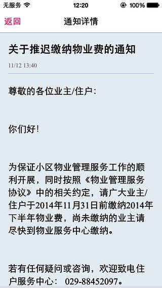物业公司通过本软件可以快速的推送通知公告信息到业主手机上;