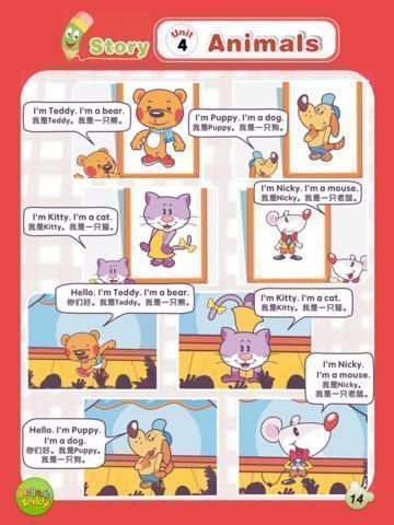 Hello Teddy洪恩幼儿英语是由中外幼教专家倾力打造的一部幼儿英语巨作,是洪恩教育专门为中国宝宝们全力定制的主题式启蒙英语教程。本教程针对中国幼儿的学习特点,依据TPR教学法、难度分解法和多元智能理论编写,提供最科学、实效、严谨的学习内容和教学模式。全套教程贴近小朋友生活,依据小熊Teddy的成长历程、生活情景展开“主题故事”式教学,48大教学主题,内容涉及水果、动物、身体、动作、数字、礼貌用语、食品、颜色、家庭、服装等方面。每个“主题故事”中均巧妙的融合了单词句型学习、字母和自然拼音学习以及外教带读。