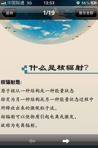 《核辐射知识》是一款教人怎样防核辐射的一款教育型APP,主要是介绍有关核辐射危害及其怎样防治等知识,是结合目前国际形势而推出的产品,贴心关切用户生活健康。