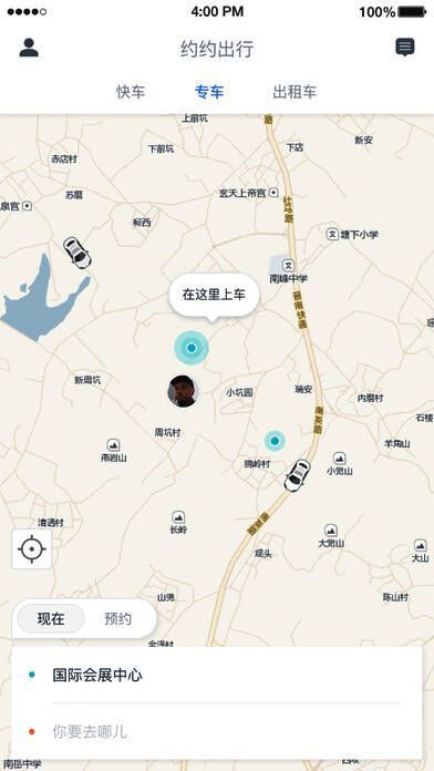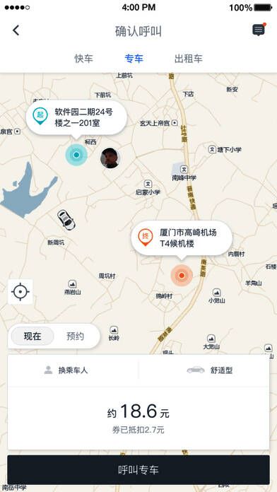 1、当前版本有3个版块,分别是专车、出租车和跨城拼车。