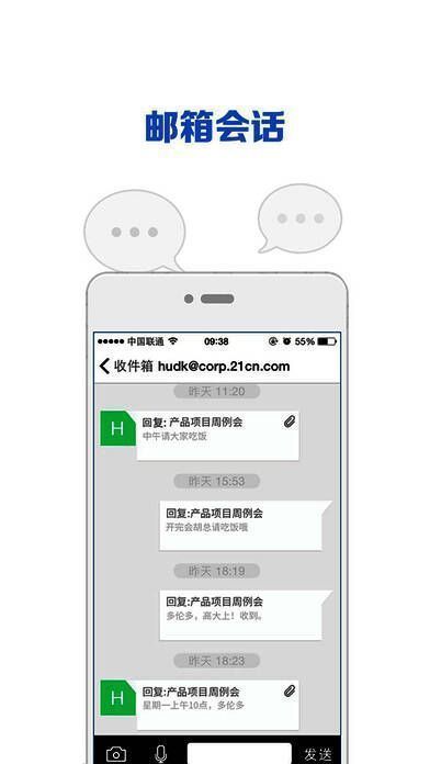 邮件对话 :支持邮件以多媒体聊天方式展现,支持语音智能输入,可回复语音或者图片邮件。
