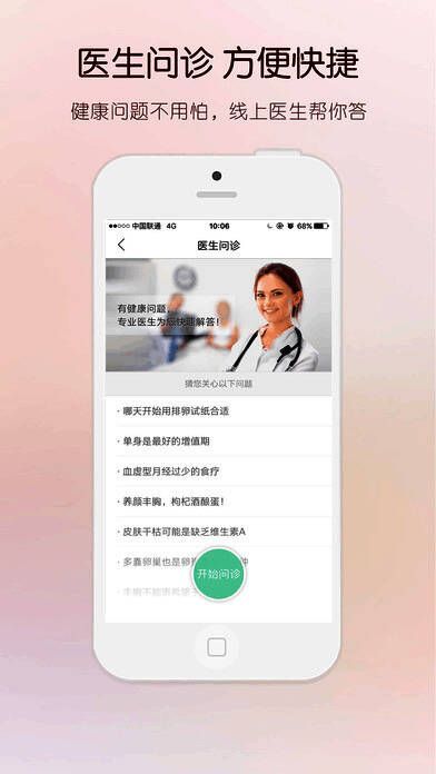 3、健康专家帮你解惑,健康贴士每天给你贴心提醒,让你不出门就能体验免费的妇科医疗服务!更有经期日历帮你记录数据,关爱女性的健康我们是NO.1!