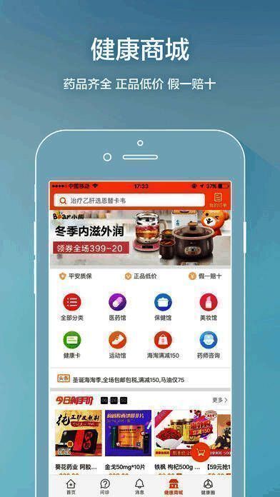 6、健康商城――保健品、药妆、运动用品、体检卡、洁牙卡等五万多款商品送货上门,平安质保,假一赔十,帮用户一站式购健康;