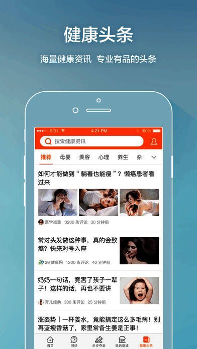 2、健康头条――云集专业医生、养生达人、健康大V,每天个性化推送千条美食、减肥、育儿、情感、两性等健康资讯,粉碎健康谣言;