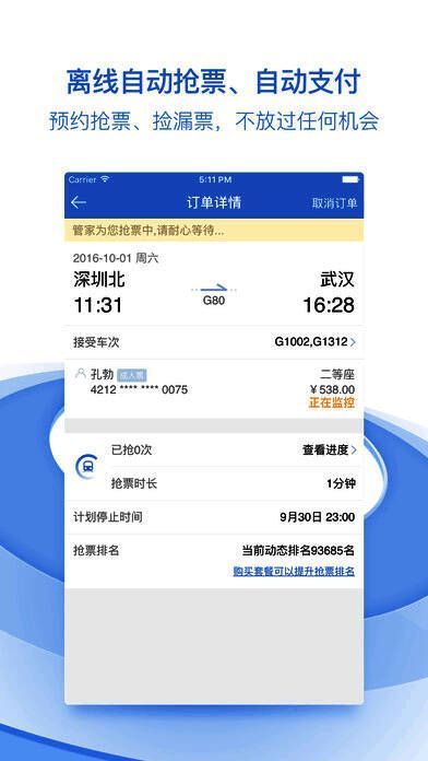 【余票监控】实时监控网络退票和改签票,一旦有余票就抢;
