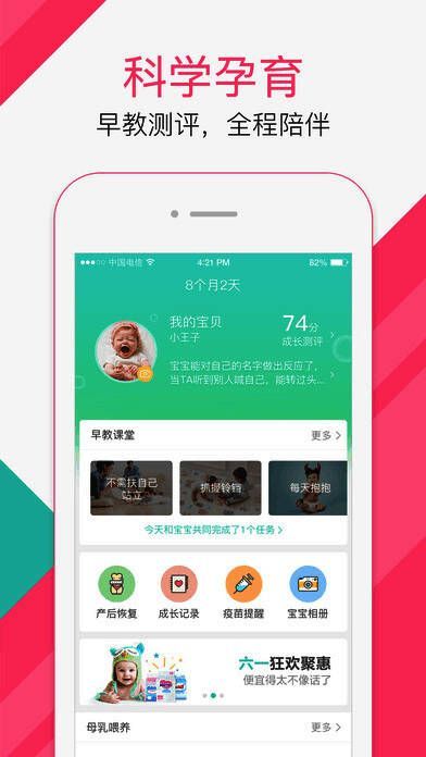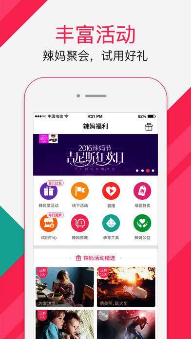 6、【丰富活动】为用户提供线上线下的丰富活动,线上参与互动赢取福利,线下亲子互动获得好礼,让妈妈的生活不再单调;