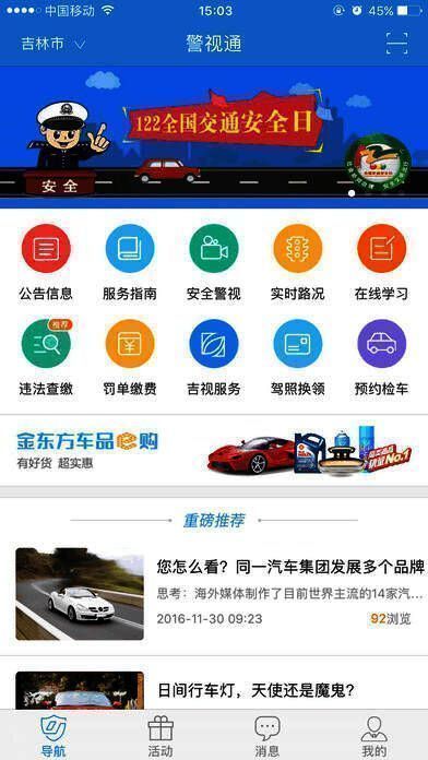 【公告消息】实现按地区推送的交管动态、时事要闻、交通警示等交通参与者关注的热门交通要闻,通过该功能可以及时了解到交警总队发布的实时消息;