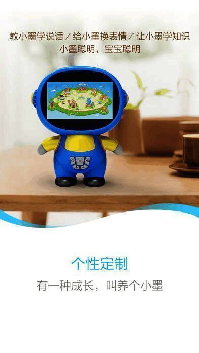 小墨儿童机器人是专为儿童定制的新一代陪伴型机器人。内置强大的AI引擎,并采用智能语音、智能互动等人工智能技术,为儿童提供全方位的陪伴。APP配合机器人使用,让远在异地的家人,实现随时随地的陪伴。