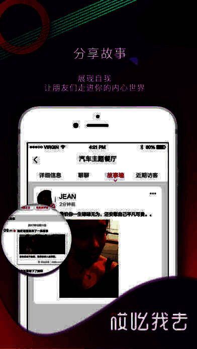 一款基于真实场景的社交APP,以故事化的运作模式连接人与场景,重新定义人在场景下的社交、娱乐和消费,还原“face to face”的社交本质,让人与人之间发生真实的、有故事的社交关系,让社交变得更真实!更有趣!更快乐!