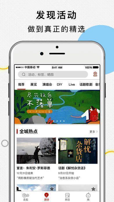 活动:走起GO精选好玩的同城活动推荐给用户,同时与优质商家和城市达人联合举办周末独家活动。活动类型包括美食、DIY、展览、演出、户外运动等