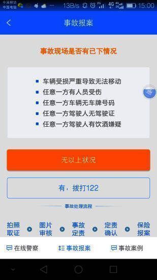 2、事故报案,上传事故证据照片或视频;以及远程定则,即时接收交警的定则结果;查找附近的快撤理赔点。