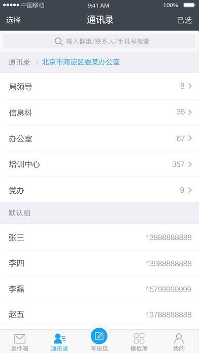 层级展示清晰明了,群组选择方便快捷。支持按群组名、单个联系人姓名和手机号的云端搜索。