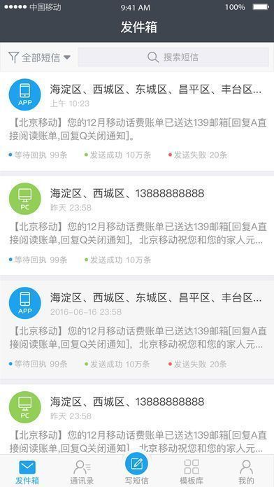 《云MAS》是一款由中国移动开发的手机端的短信群发软件。用户在手机上可以进行短信的编辑和快发,还有海量的优质短息模板供用户选择,还会为用户进行短信回执的实时刷新,让用户更好的掌握短信的送达情况。