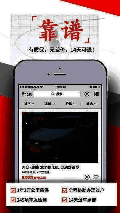 2、100%车源质量严格把关,直接与车主交易,透明无差价,跳过4S店车贩等中间利润差价249项专业检测确保信息透明,100%杜绝事故车、水泡车、过火车;