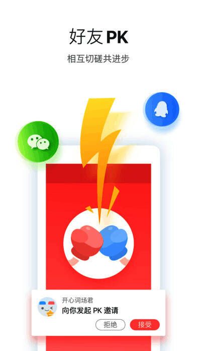 【好友PK】好友实时PK,除了词场内的小伙伴外,还可以随时和微信及QQ里面的好友进行单词PK,想用词汇量碾压身边的小伙伴,现在就去;