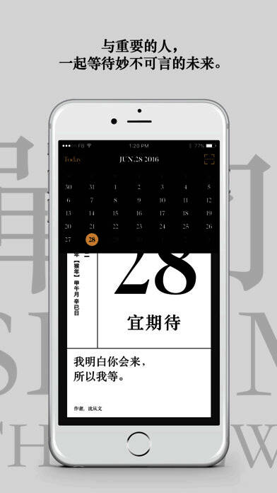 《单向历》是一款专业的手机日历,不光如此,它还独具特色,界面简洁明了,每日都有特色的文字与词语呈现,让你的每一天都能有个新的开始!如同生活在不可预知的等待之中,对未来的渴望!