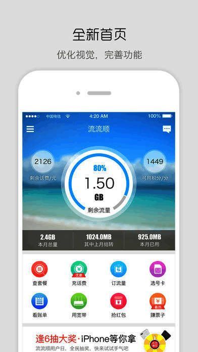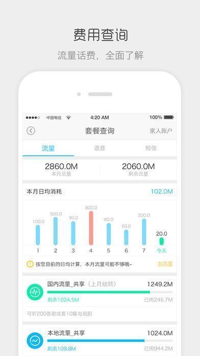 统计全面性:可分类实时监测用户套餐剩余流量、本地流量、国内流量、共享以及定向流量、流量卡等流量信息,精准查询,还能及时掌握话费余额,确保您畅享网络;