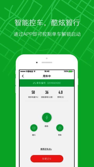 3、手机APP还车,自动锁车并结算费用,不再担心未关车锁导致扣费;
