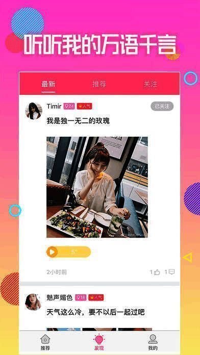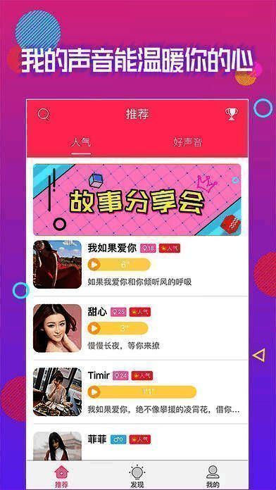 夜声是一款全球语音交友社交软件。秀出自我,分享生活,让我们通过声音了解彼此吧;