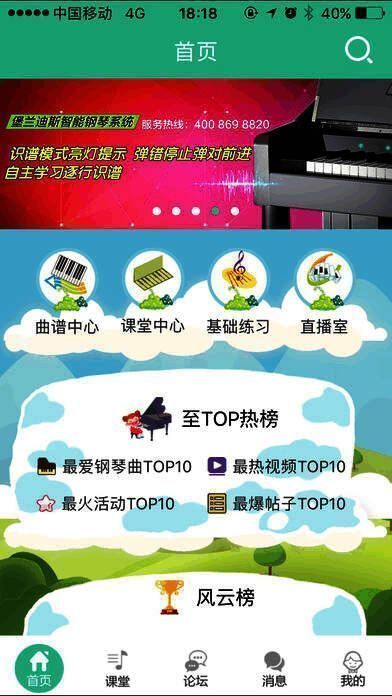 4、乐乐GO分为曲谱中心、课堂中心、论坛和直播室等四大板块,进入曲谱中心,可选择识谱模式或跟弹模式,还可进行分手练习及反复练习,可记录弹奏成绩、查看并转发分享;
