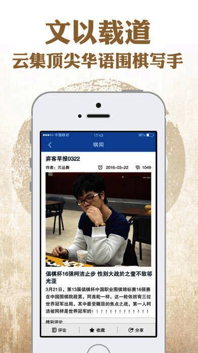 围观大赛直播、与职业解说互动,获取时时的比赛新闻和棋手资讯;