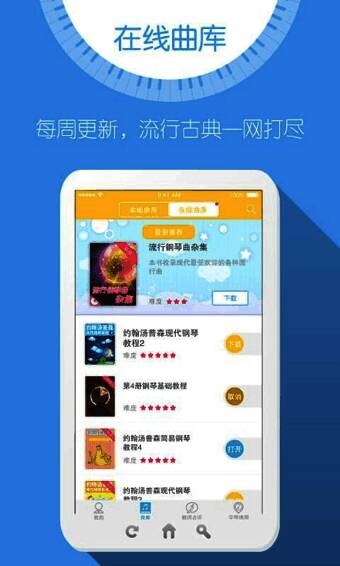 《弹吧钢琴》提供专业钢琴考级、拜厄、巴赫、车尔尼、汤普森、哈农、布格缪勒、久石让、巴斯蒂安、理查德·克莱德曼流行钢琴曲等海量免费专业曲谱,解决传统练琴教材的购买、保管、携带不便的问题,更有独家钢琴曲谱阅读器,帮助用户更快地理解、掌握曲谱。