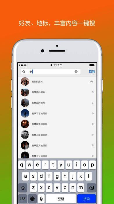 5、利用搜索功能,找到本人、好友、地点等相关的照片;