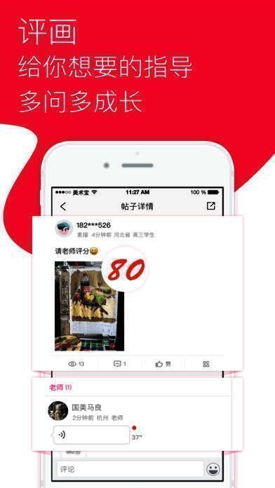 美术宝,美术生必备神器。国内的专业化美术生学习交流软件,是一款针对全国美术考生和绘画爱好者提供学习交流与实时评画答题的软件。这里汇集了全国各路画霸交流切磋,随时上传分享你的美术作品与经验。在学习绘画的过程中遇到不会画和不懂的地方,只需用手机拍照上传或者进行语音提问,在线美术教师将为你解答指导。还有艺术类院校资讯供实时查阅及优秀作品范画、视频供参考学习。