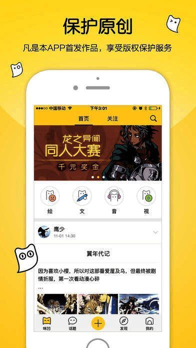 1、咪凹,完全尊重版权的内容原创社区,文手、画手、舞见、唱见、UP主、同人社团、音乐社团的自由交流园地。这里可找到柄图、设计图、人设、立绘等图画作品,也能找到小说、段子、评论、等精彩文章;