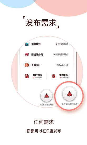 服务行业入口,一句话发布需求,轻松搞定生活需求,汇聚海量与生活服务相关的服务商、自由服务者,一键下单,快速为用户提供精准解决方案,随时随地解决生活中的各种琐事难题。