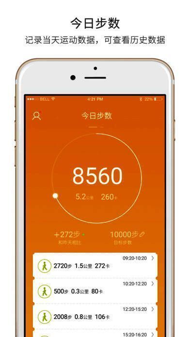 4、时刻记录每一天的步数统计,卡路里消耗,走动时长和距离,并可提供分享页面到社交平台;