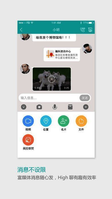 7、支持收发文本、表情、语音、图片、视频、文件、位置、阅后即焚、名片消息体;