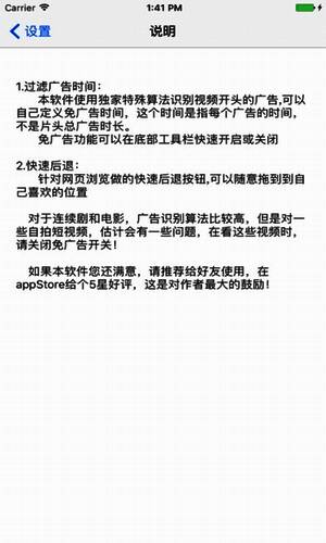 1、采用自家独创的广告识别算法,识别出电影,电视剧开头的广告,自己自定义广告时间段来屏蔽广告!