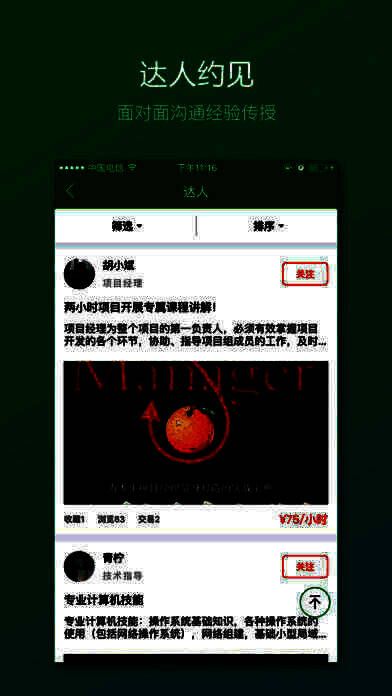 2、达人约见:每一位达人出售的技能或服务都是通过严格的审核,保障你花的每一分钱都是值得的;