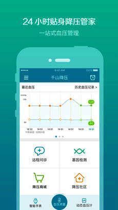 千山降压app是一款血压测量与控制辅助软件。软件随时记录用户血压状况,检测人体基因情况,通过科学的方式为用户提供医疗与控制辅助,测量与治疗数据云端存储,用户可随时在线查看。利用个性化用药基因检测技术、可穿戴医疗设备技术、远程医疗、慢病管理标准化服务流程模式,为患者找到最佳“慢病管理整体解决方案”,探索慢病精准医疗发展新模式。