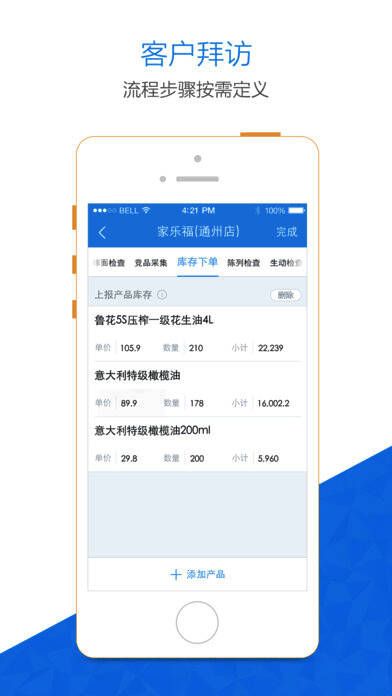 4、拜访流程管理提前制定拜访计划,日历提醒,目标明确。采用自定义工作模版,遵照“拜访八步骤”,按流程逐项推进,提升拜访质量。现场完成拍照、记录、补货订单提交等工作,信息传递更迅捷。