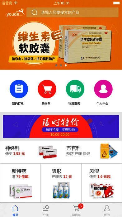 《优德医药》是由国家药监局认证的网上购药的商城。用户可以在这里买药、资讯相关病情,为用户提供安全便宜的网上购药商城,并且有专门的执业医师为用户解答病况的资讯,为用户提供专业的用药建议。