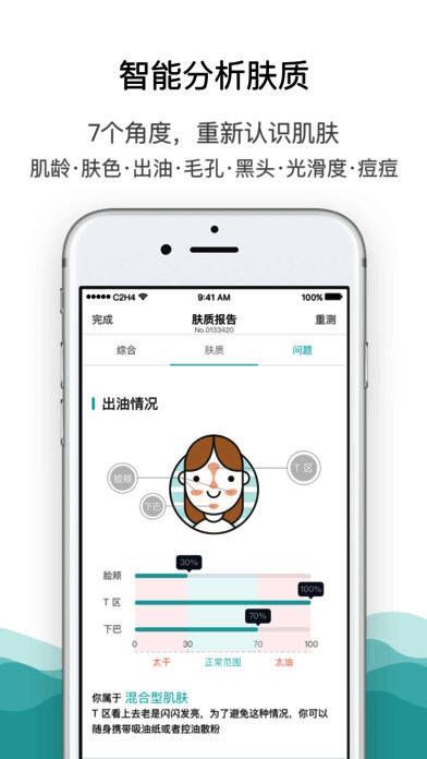 5、从肌龄、肤色、出油、痘痘、黑头、毛孔、光滑度等多个角度,全面分析肤质;