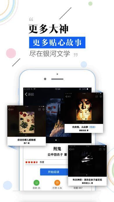 银河文学app是一个有趣而开放的文学故事创作、阅读平台。拥有创作激情的人们,可以在这里以任何形式,任何个人舒服的绝对自由的方式发布自己创作的故事,而没有任何的限制和边界。