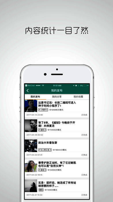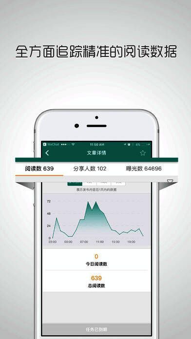 3、完美数据追踪,图形化体现。直观地告诉你阅读量、曝光量和转发数等,让你更好的数据化运营。