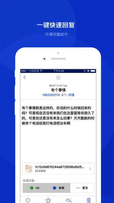 商务密邮另一大特点是增设了一键回复功能,此功能包含多条常用回复语,让用户在第一时间对邮件进行反馈,确保沟通不间断。