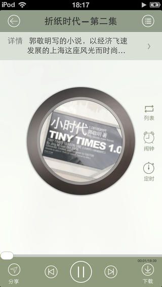 支持断点续听、在线听、下载听,WIFI环境下一键下载全辑!订阅历史功能,不用寻找,一键收听所有喜欢的节目。
